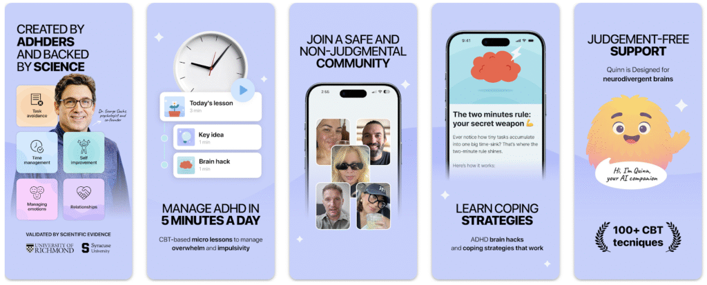 Inflow is one of the most well-known apps built specifically for people with ADHD. Instead of acting like a basic productivity tool, it focuses on helping adults understand how ADHD shows up in daily life. The app combines behavioral science, including CBT-based techniques, with short lessons, practical exercises, and structured guidance.