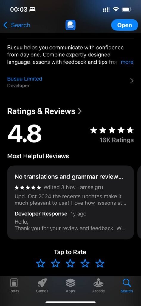 User reviews show that Busuu enjoys strong goodwill: on the App Store it holds a 4.6-star average based on about 12.4 k ratings. On Google Play it reports 50 million+ downloads and 1.01 million reviews, with an overall rating around 4.7 stars. Users often praise its structured lessons and friendly community feedback, though some note limits beyond the intermediate level.