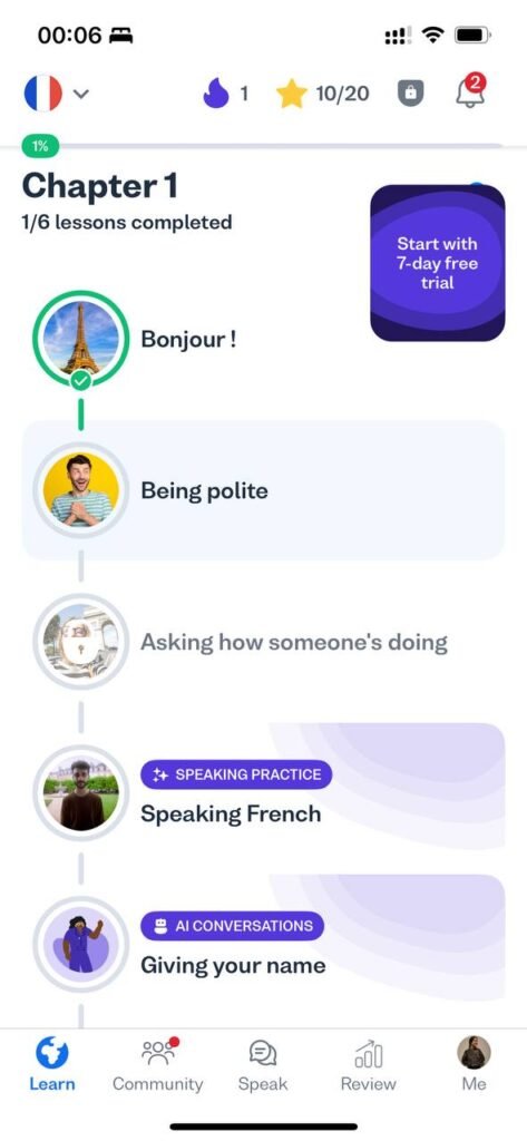 Busuu provides a structured roadmap, making it feel more like an online language course than a game. It includes study plans, daily goals, grammar review sections, vocabulary exercises, and speaking challenges. Premium users also get personalized study plans with estimated completion dates.