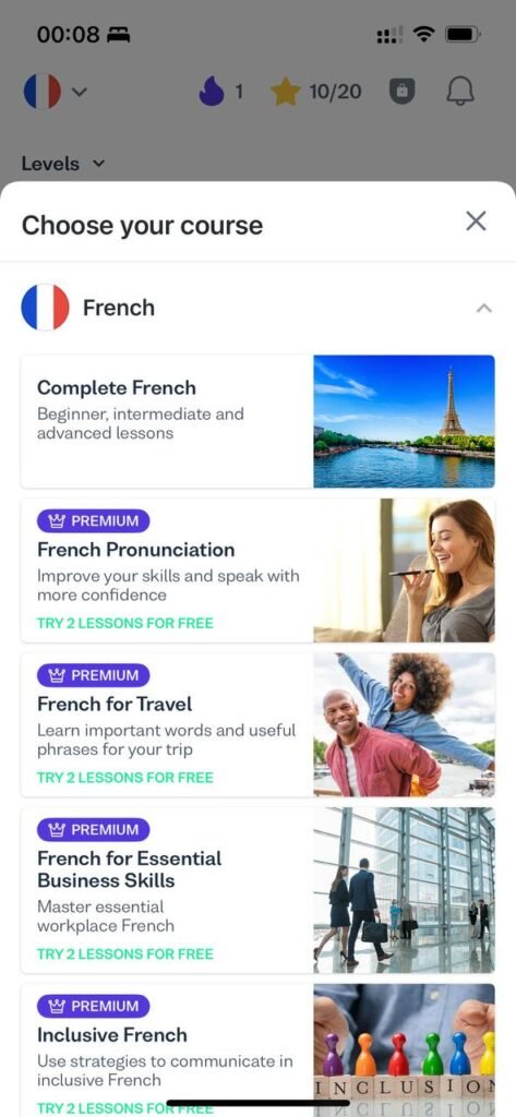 Memrise covers over 20 popular languages such as Spanish, French, Japanese, and Korean, as well as less common languages. It also offers themed vocabulary courses on topics like travel, business, and culture. While the platform used to rely heavily on community-created courses, it now focuses more on official courses created by language experts.