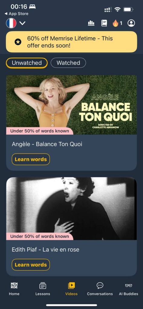 Memrise, on the other hand, feels fun and effortless, almost like scrolling through TikTok but for languages. The native speaker video clips are great for picking up real accents and slang, and the spaced repetition system works—words actually stick. It’s the kind of app you open when you have a spare minute and want to feel productive without committing to a full lesson. However, after a while, I noticed I could remember words but wasn’t always confident using them in full sentences.
