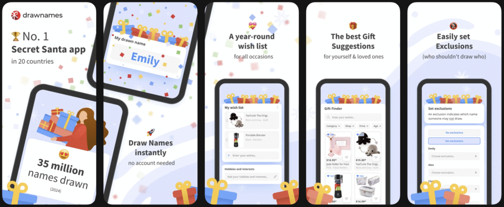 Although it includes basic wish list functionality, DrawNames is intentionally lightweight. It doesn’t offer event hubs, anonymous messaging, or advanced gift ideas. The interface is clean and extremely intuitive, making it ideal for tech-shy groups, family gatherings, friend circles, or last-minute holiday plans where simplicity matters more than extra features.