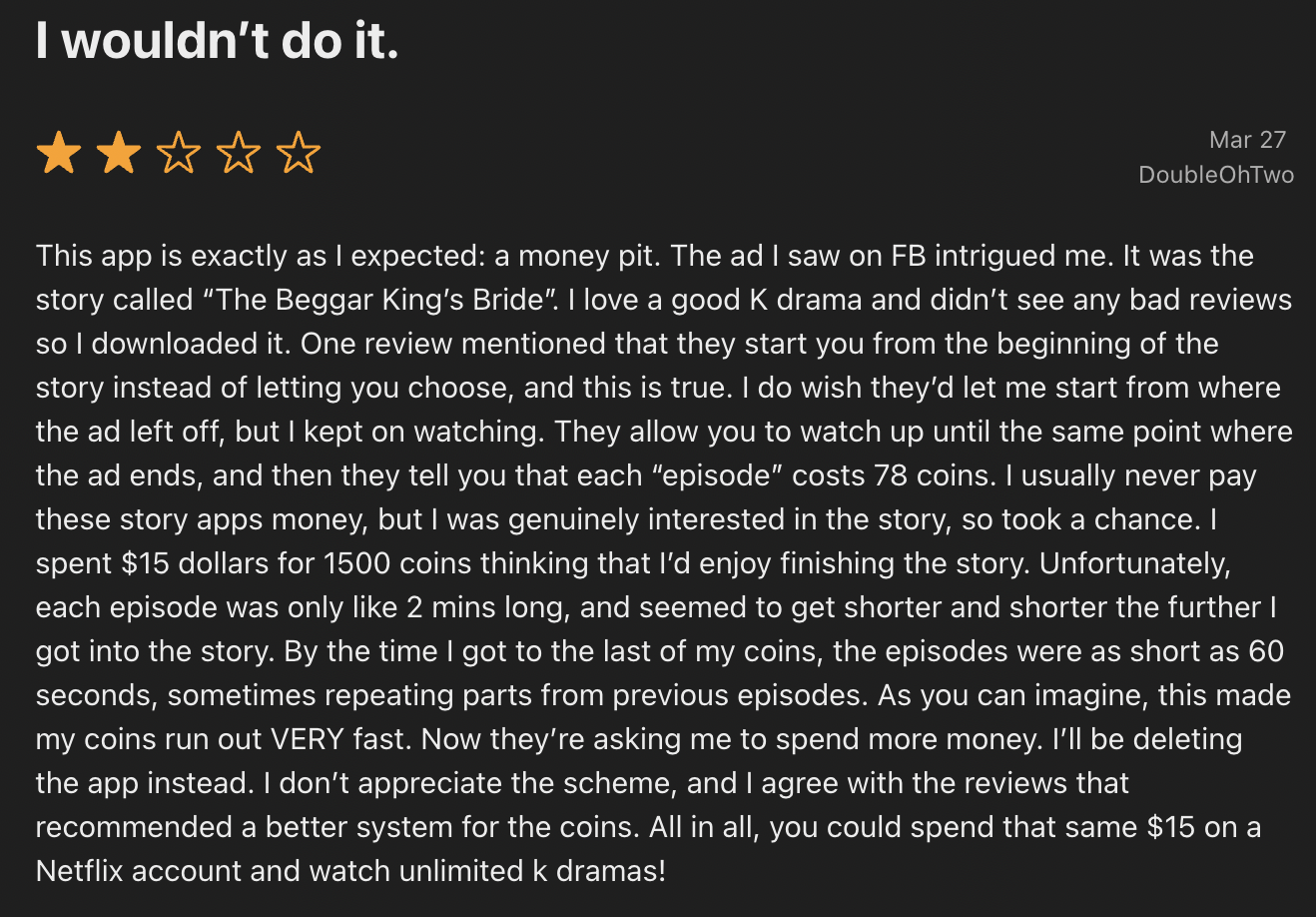 At the same time, many users express frustration with the monetization methods and ads. A common complaint is that unlocking full stories often requires either paying real money or watching a large number of ads (sometimes longer than the episodes themselves), which detracts from the experience for some. Others feel the app is too expensive — with high subscription or coin costs that don’t feel justified by the content. App Store