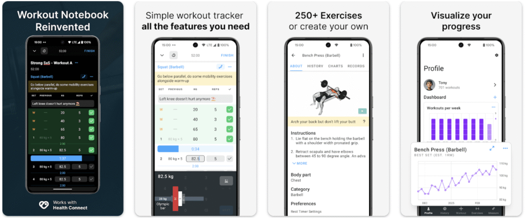Both apps cover the basics very well. Strong publicly lists supersets, custom exercises, timers, RPE, advanced charts, and workout scheduling. Hevy’s official materials and help center show logging, routines, previous workout values, exercise notes, timers, plate calculator, and workout planning tools.