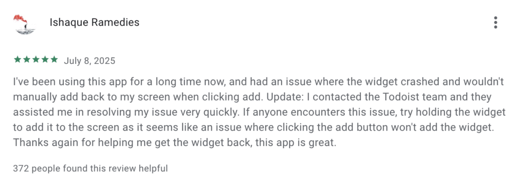 Users of Todoist often praise its clean interface, seamless sync across devices, and integration with tools like Google Calendar and Gmail, with one reviewer on Google Play noting how the free version “is plenty for my needs, and it has no ads,” and appreciating how natural language makes task entry easy. GooglePlay Many also appreciate that Todoist helps them organize both personal and professional tasks with clarity and structure. AppStore However, some users point out drawbacks — for example, certain features like reminders and collaborative tools are locked behind the paid tier, which can limit functionality for free users, and there are occasional comments online about the interface feeling overwhelming if you’re new or have many tasks.