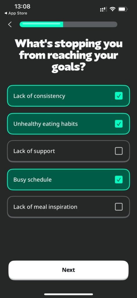 - Profile Setup – You start by entering your age, height, weight, activity level, and goals (lose, maintain, or gain weight).