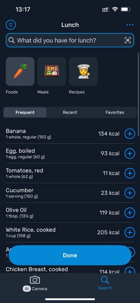 - Food Logging – You log your meals using the massive food database or barcode scanning. It remembers frequent items, so logging gets faster over time.