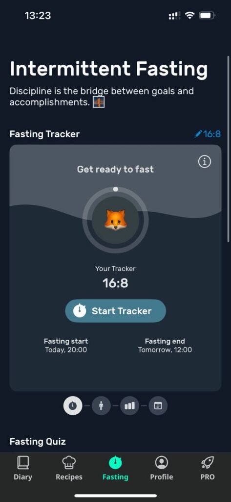 - Free plan: includes calorie tracking, food diary, basic fasting, and daily goal tracking.